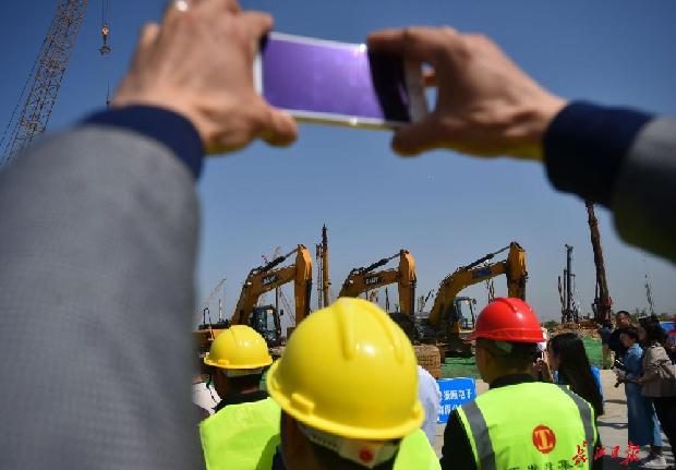 4月9日,武汉市招商引资重大项目集中开工,东西湖区京东方项目现场,工人们现场见证开工。记者郭良朔 摄